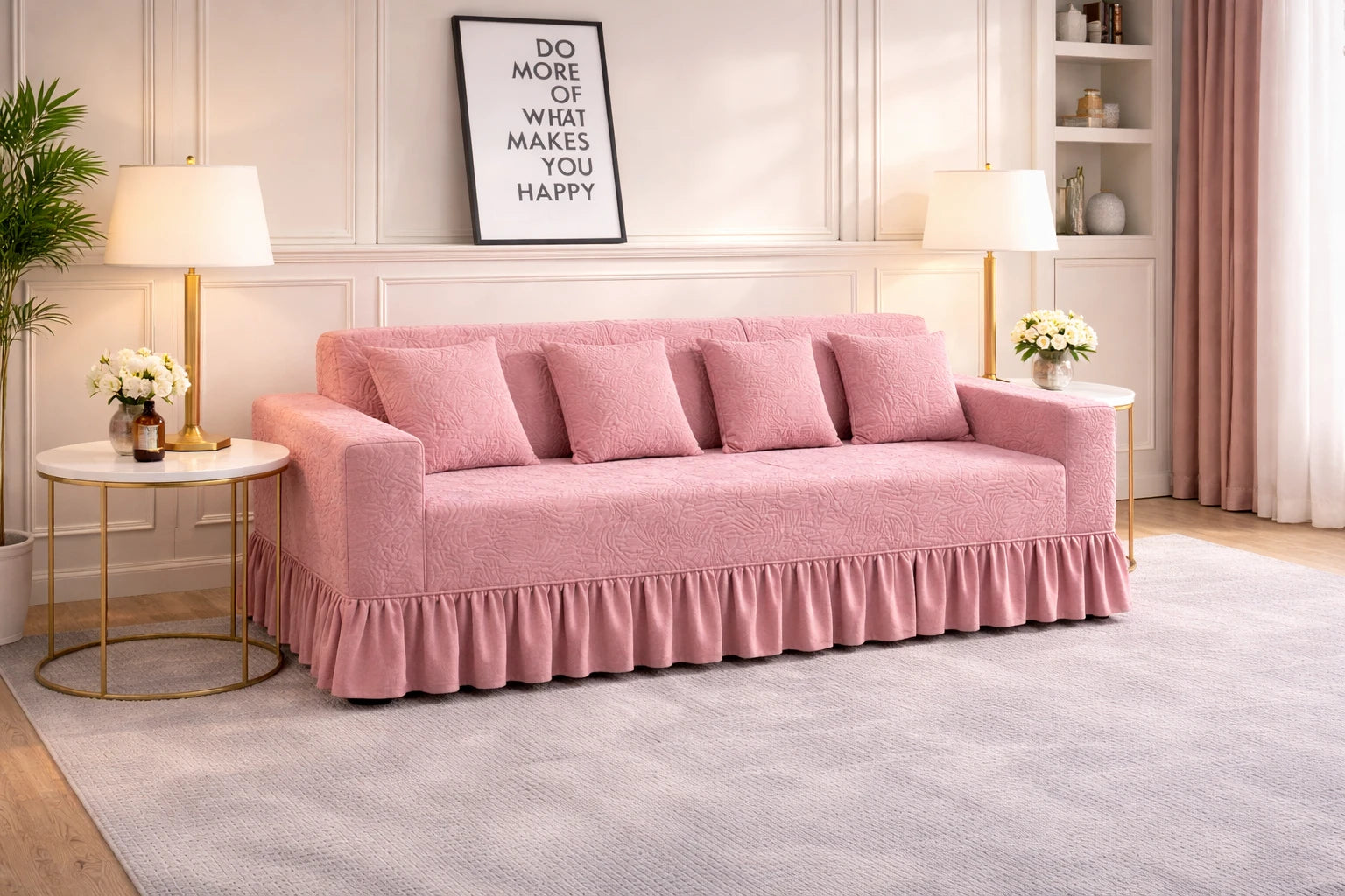 Premium Pink Frill L Shape Sofa Cover – Stretchable, Washable & Elegant Sofa Protector